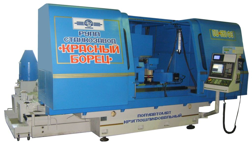 Movement of all working bodies is carried out by means of ball-screw pairs. The axis of the grinding wheel is rotated on the wheel head at an angle of 26.34 degrees relative to the axis of the part. The wheel head is equipped with a mechanism for the orientation of the workpiece (determining the position of the part end by the Z coordinate). Hydraulic equipment is made by a separate unit and is installed to the right of the machine, and the cooling system at the back to the left. On the right side of the back there is an electric cabinet with electrical equipment, and in front there is a control panel with a CNC system.