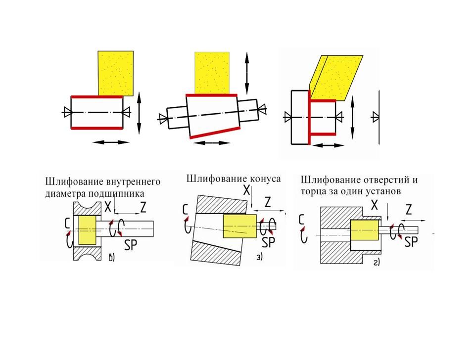 The periphery of the grinding wheel of the main drive and the grinding wheel of the internal wheel head is dressed using a dresser diamond due to the longitudinal movement of the table and the transverse movement of the grinding wheel (linear interpolation by two coordinates)