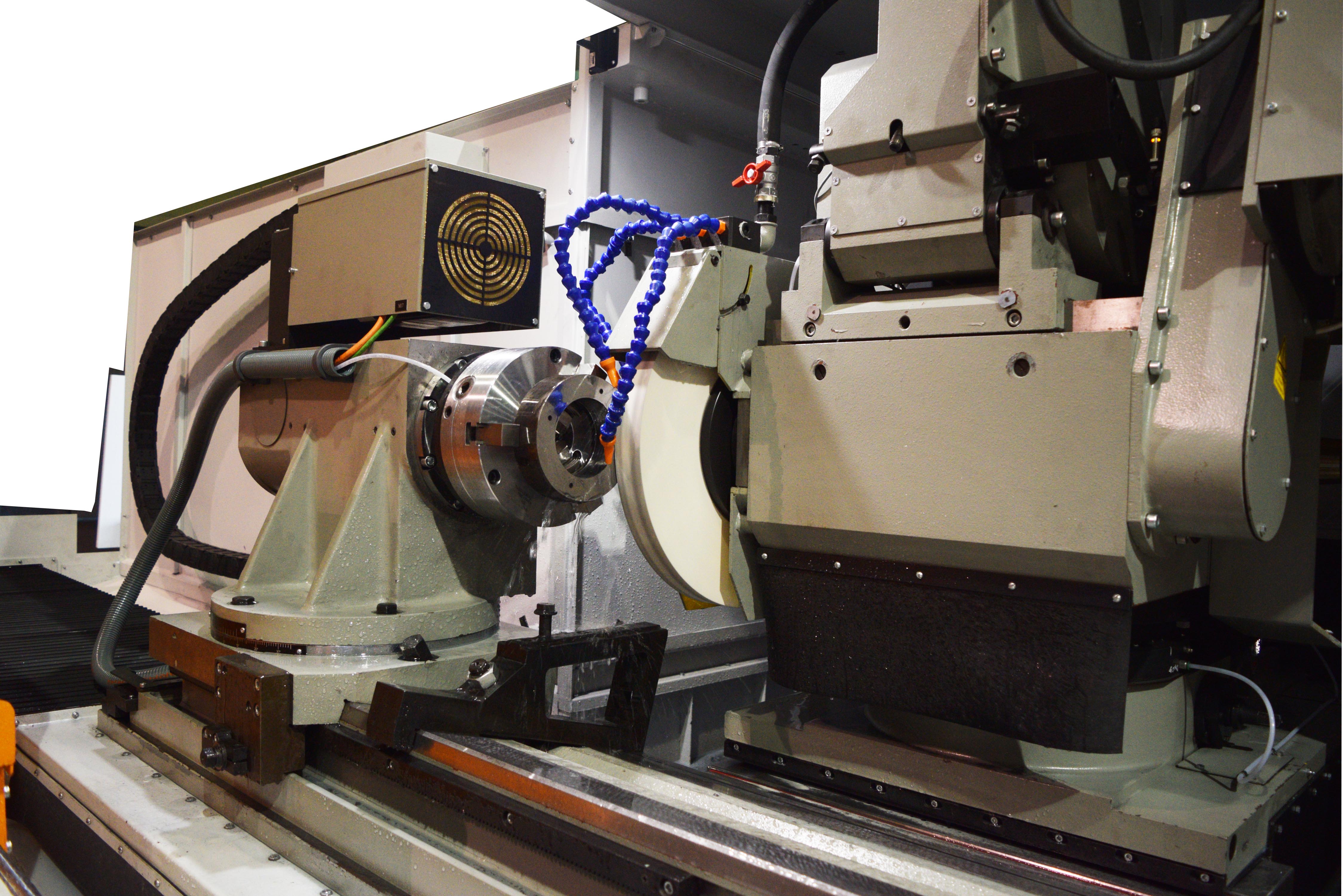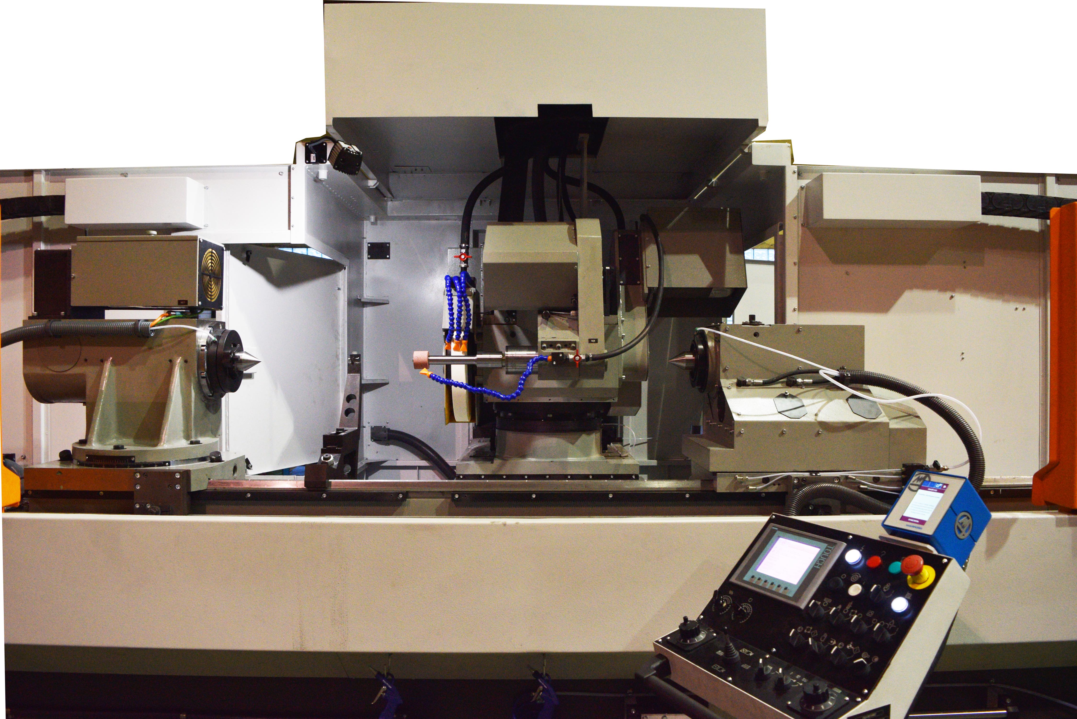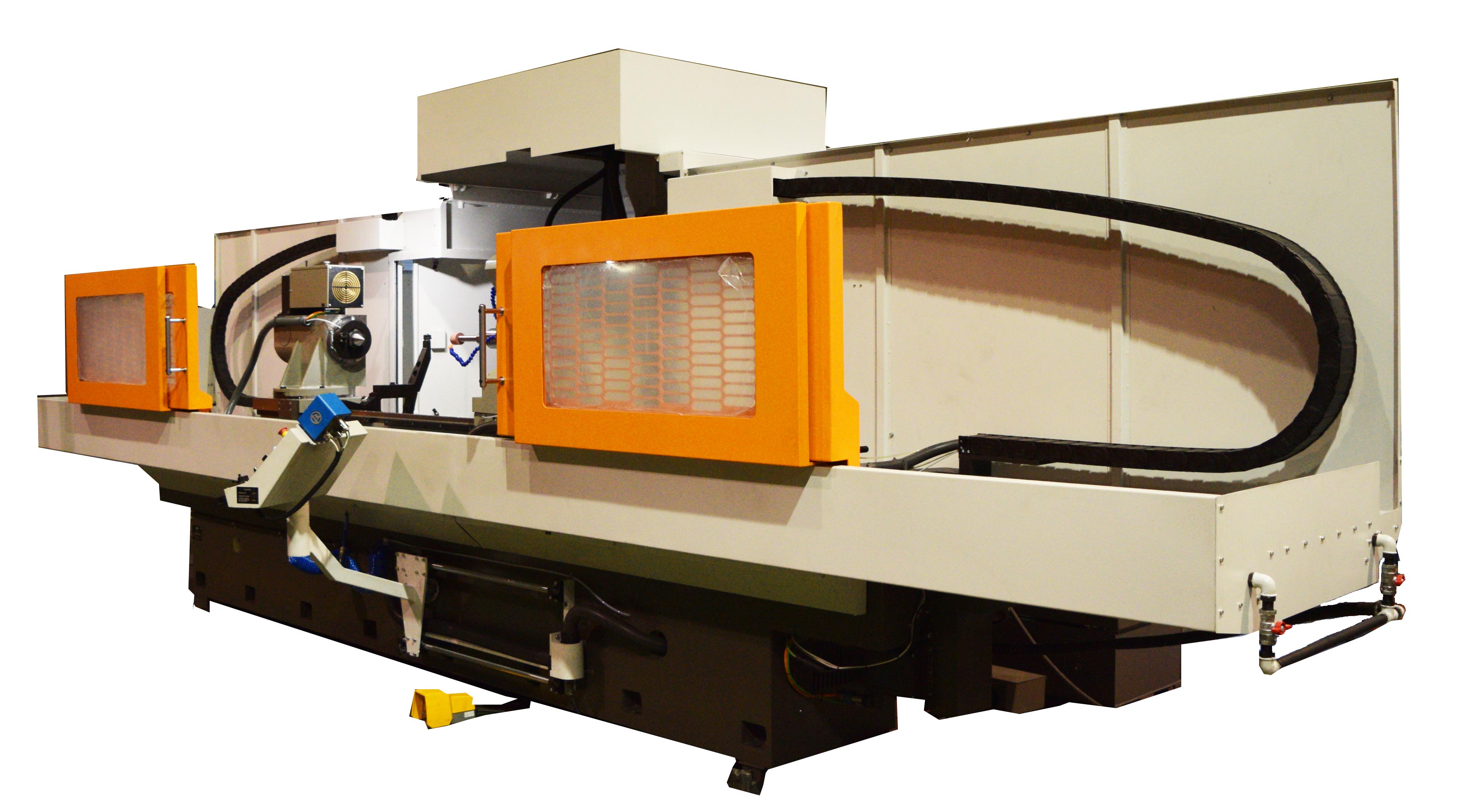 The machine has a layout with a movable table moving along the axis of the part (z coordinate) on which the work piece is installed and a wheel head moving in the transverse direction (x coordinate). The wheel head has two spindles for external grinding.