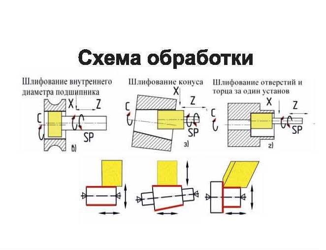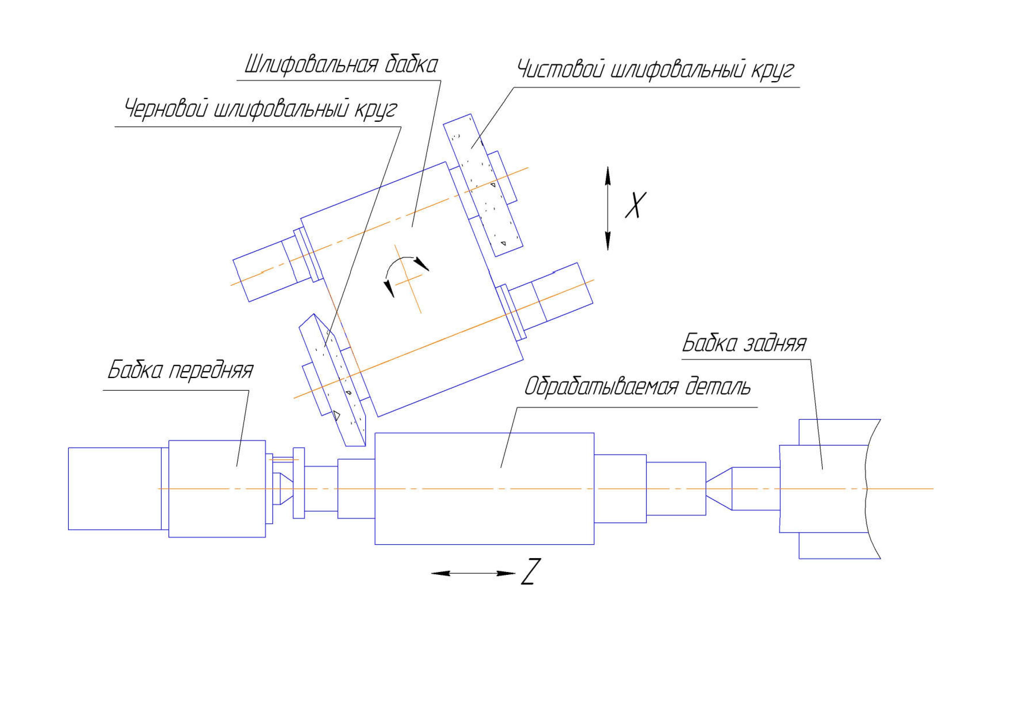 Grinding of parts is performed by rotating the workpiece and moving the wheel head perpendicular to the axis of the centers. The wheel head can be manually rotated in the horizontal plane at an angle of +45° - 180°. Surface treatment and the grinding wheel dressing can be performed either manually or with the control of the command controller automatically, the installation and removal of parts are carried out using the customer's shuttle device.
