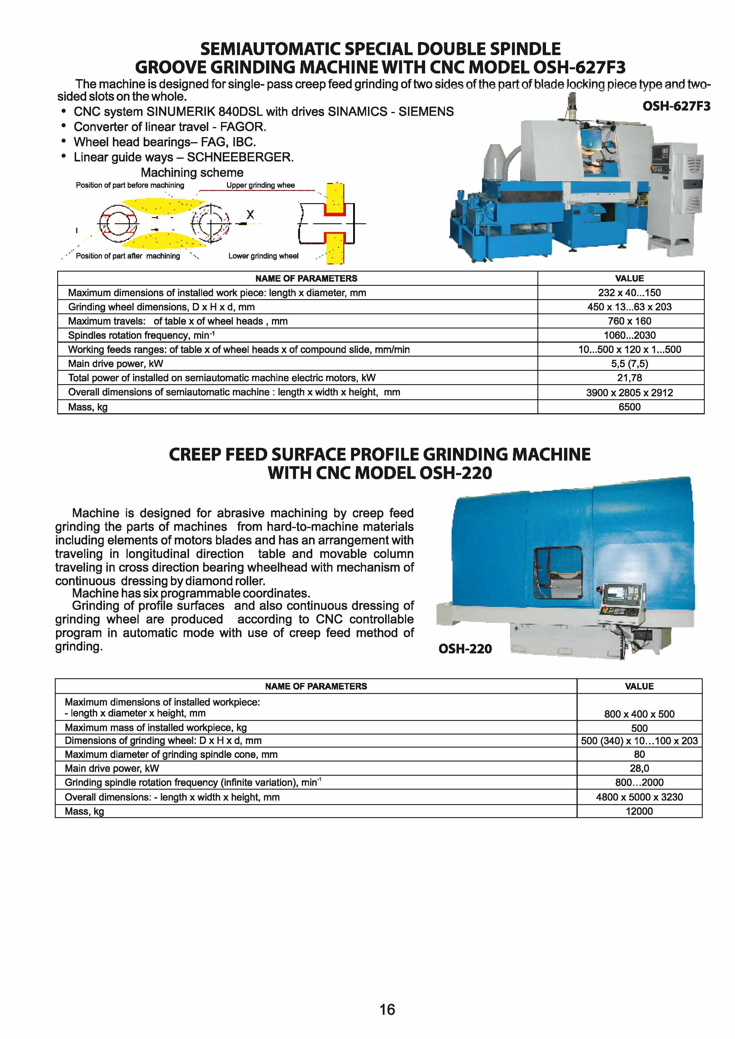 SEMIAUTOMATIC SPECIAL DOUBLE SPINDLE GROOVE GRINDING MACHINE WITH CNC OSH-627F3. The machine is designed for single- pass creep feed grinding of two sides of the part of blade locking piece type and two-sided slots on the whole.