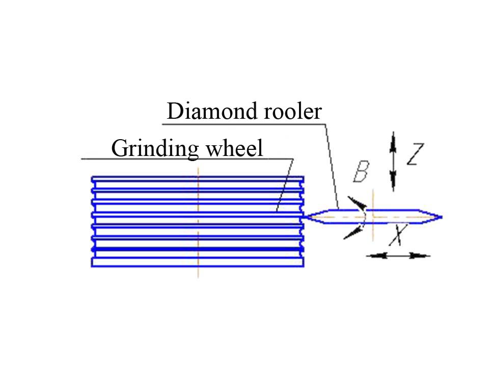 Machine has the arrangement with dressing mechanism traveling in longitudinal and cross directions relative to motionlessly rotating grinding wheel. Dressing is produced by a special rotating diamond roller which has the opportunity of turn to the left and right sides relative to the top of radius (R=0.2 mm) of diamond roller.