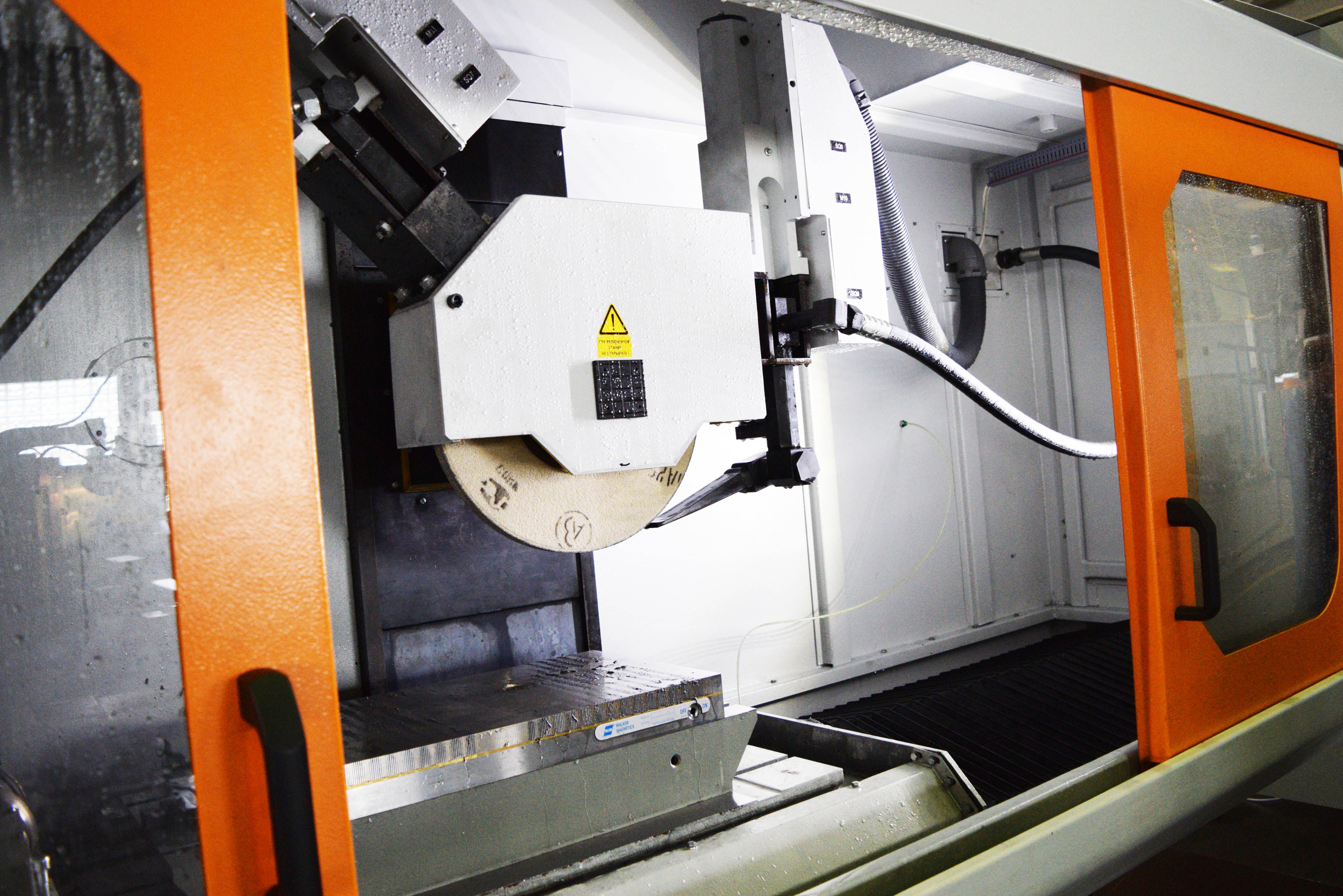 Equipping of machine with high-speed electric spindle or spindle Fortuna. Machine is equipped with wheel head with horizontal spindle. Electric spindle with heightened number of revolutions (n=42000 rpm) or spindle Fortuna can be used as a spindle.
