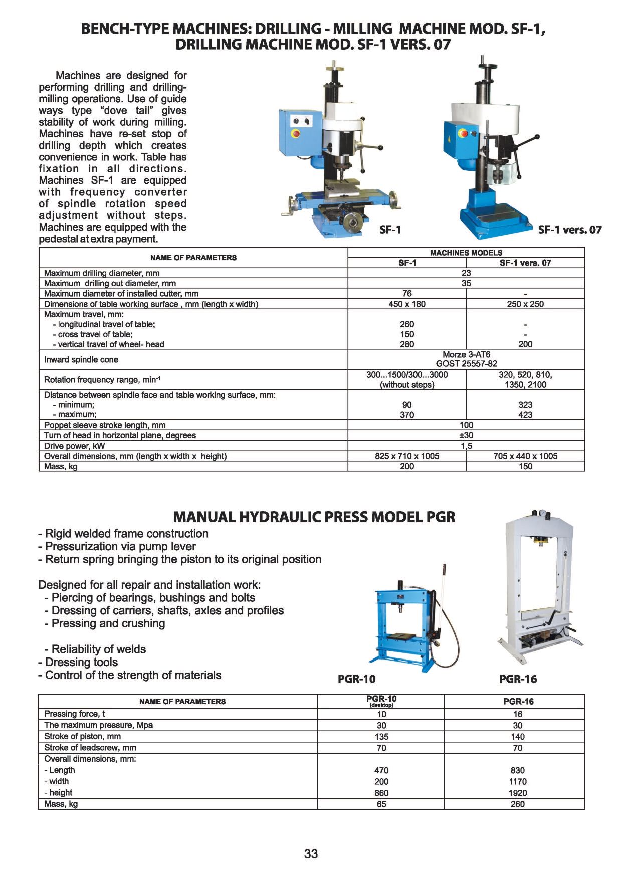 Machine is designed for performing drillingoperations. Use of guide ways type “dove tail” gives stability of work during milling. Machine have re-set stop of drilling depth which creates convenience in work. Table has fixation in all directions. Machine is equipped with the pedestal at extra payment.