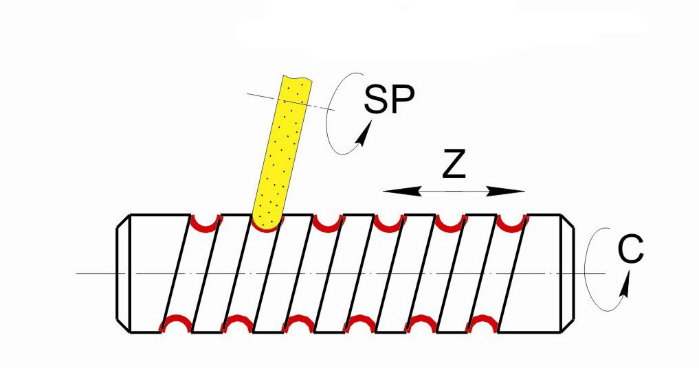 Rotation of mechanism screw is realized by synchronous motor. Rotation of grinding wheel (coordinate “Sp”) is realized from electric motor with frequency adjustment for supporting the constant speed of cutting for wheel wear.