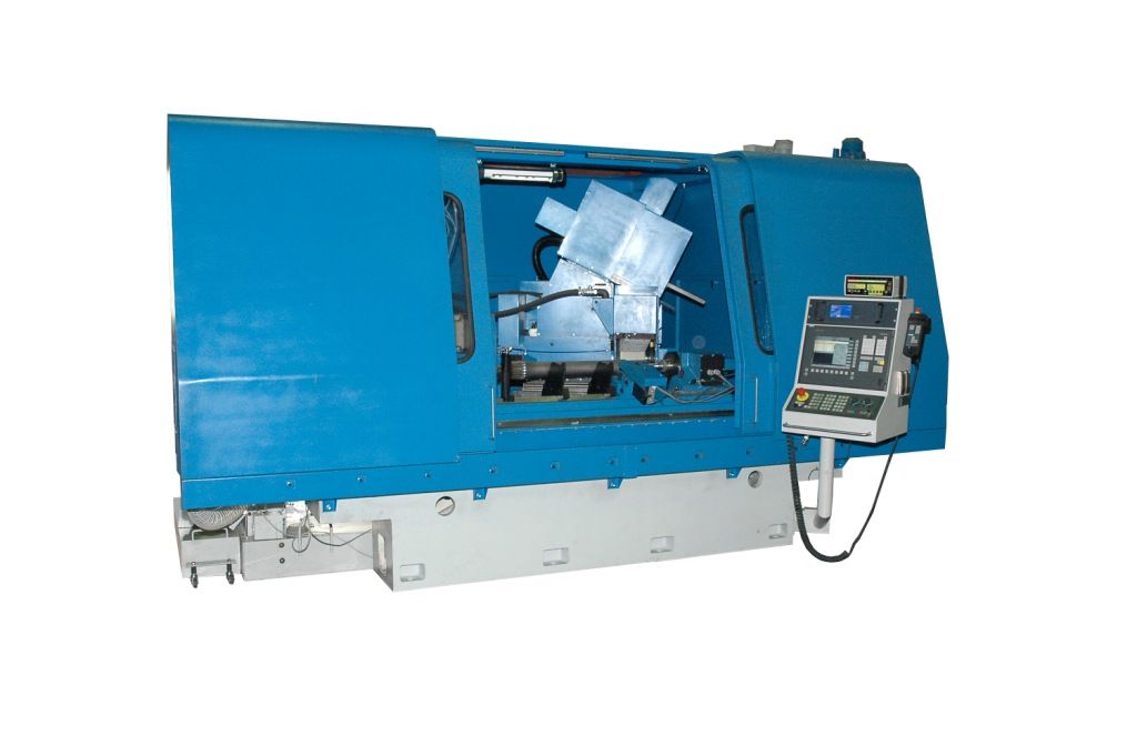 Movement of all working bodies is carried out by means of ball-screw pairs. The axis of the grinding wheel is rotated on the wheel head at an angle of 26.34 degrees relative to the axis of the part. The wheel head is equipped with a mechanism for the orientation of the workpiece (determining the position of the part end by the Z coordinate). Hydraulic equipment is made by a separate unit and is installed to the right of the machine, and the cooling system at the back to the left. On the right side of the back there is an electric cabinet with electrical equipment, and in front there is a control panel with a CNC system.