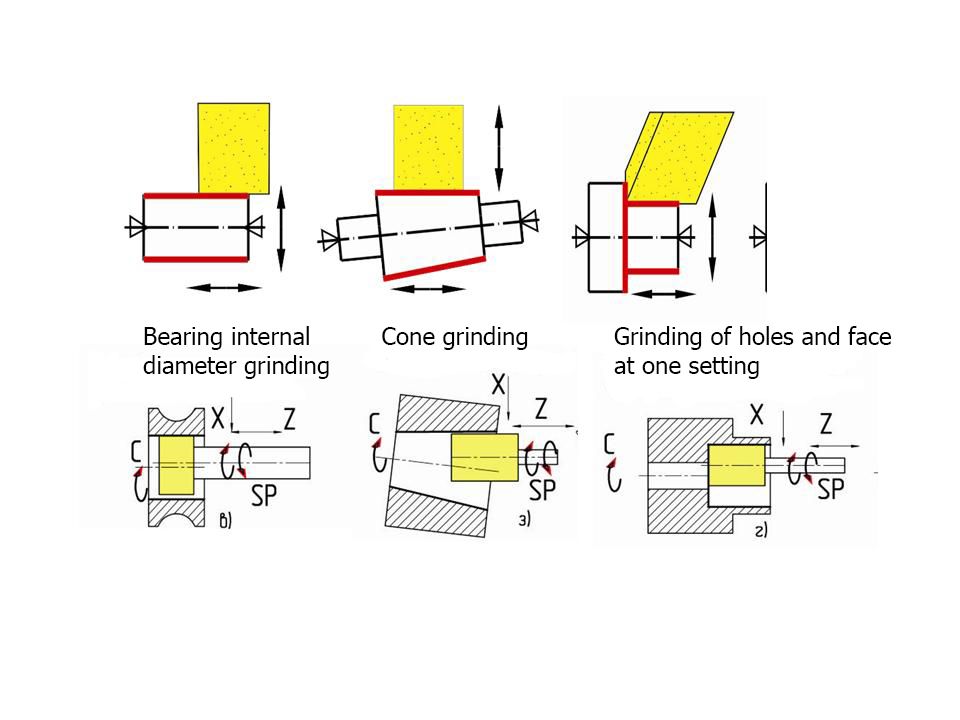 The work head and the tailstock are attached to the upper working surface of the movable table. The wheel head is moved along the linear rolling guides by means of a ball-screw transmission. The work head has the option of manual rotation to 90 degrees, wheel head has two spindles for external and internal grinding, it also has the ability to manually rotate at an angle of ±30. The internal grinding spindle is rotary. The upper table can be rotated at an angle (3 ° clockwise and -3 ° counterclockwise) and is based on the lower table, which in turn moves along the slide rails of the bed. The periphery and end of the grinding wheel are dressed using dresser diamonds of the dressing mechanism installed on the upper table due to the longitudinal movement of the table and the transverse movement of the grinding wheel (linear interpolation by two coordinates).