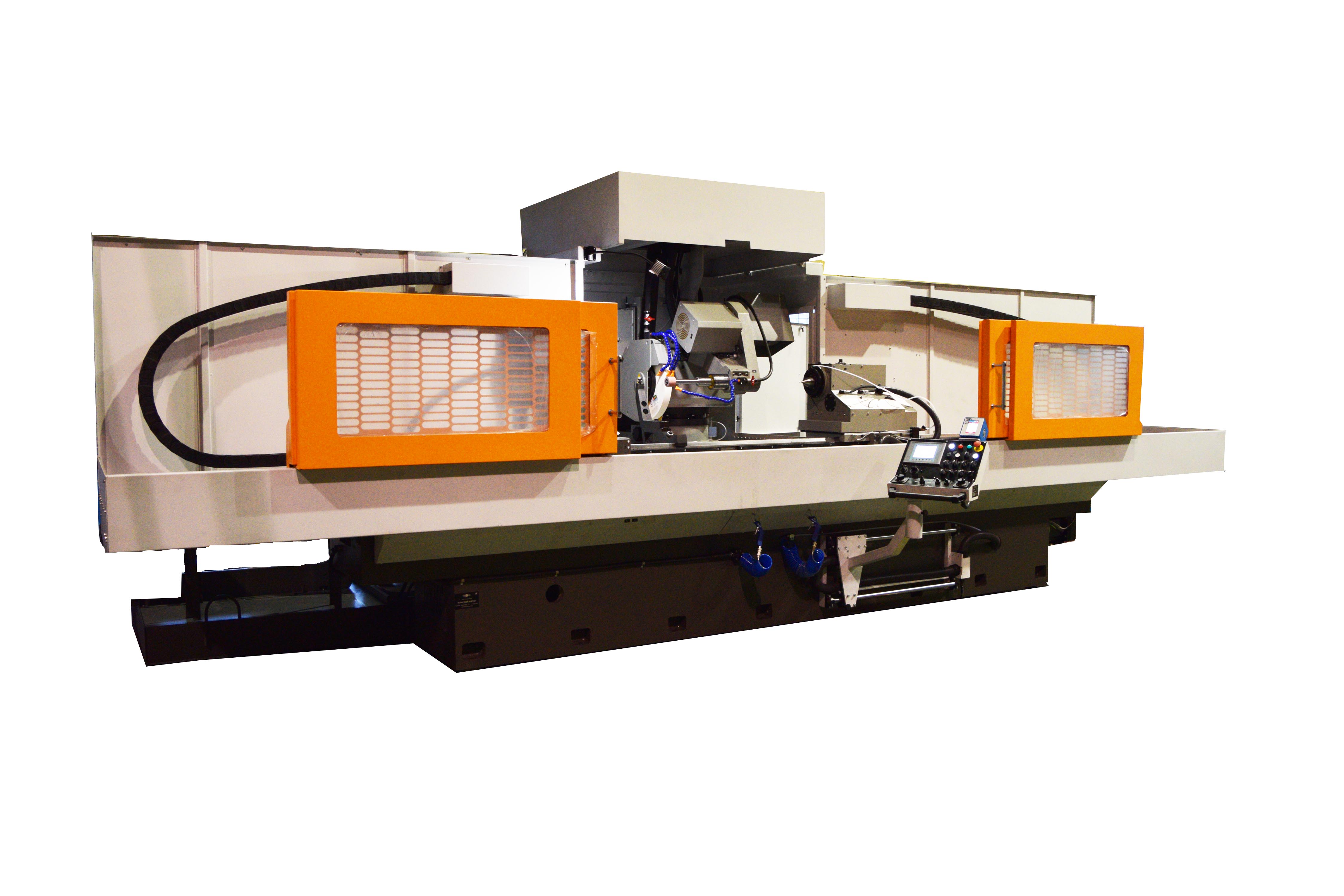 The machine has a layout with a movable table moving along the axis of the part (z coordinate) on which the work piece is installed and a wheel head moving in the transverse direction (x coordinate). The wheel head has two spindles for external grinding.