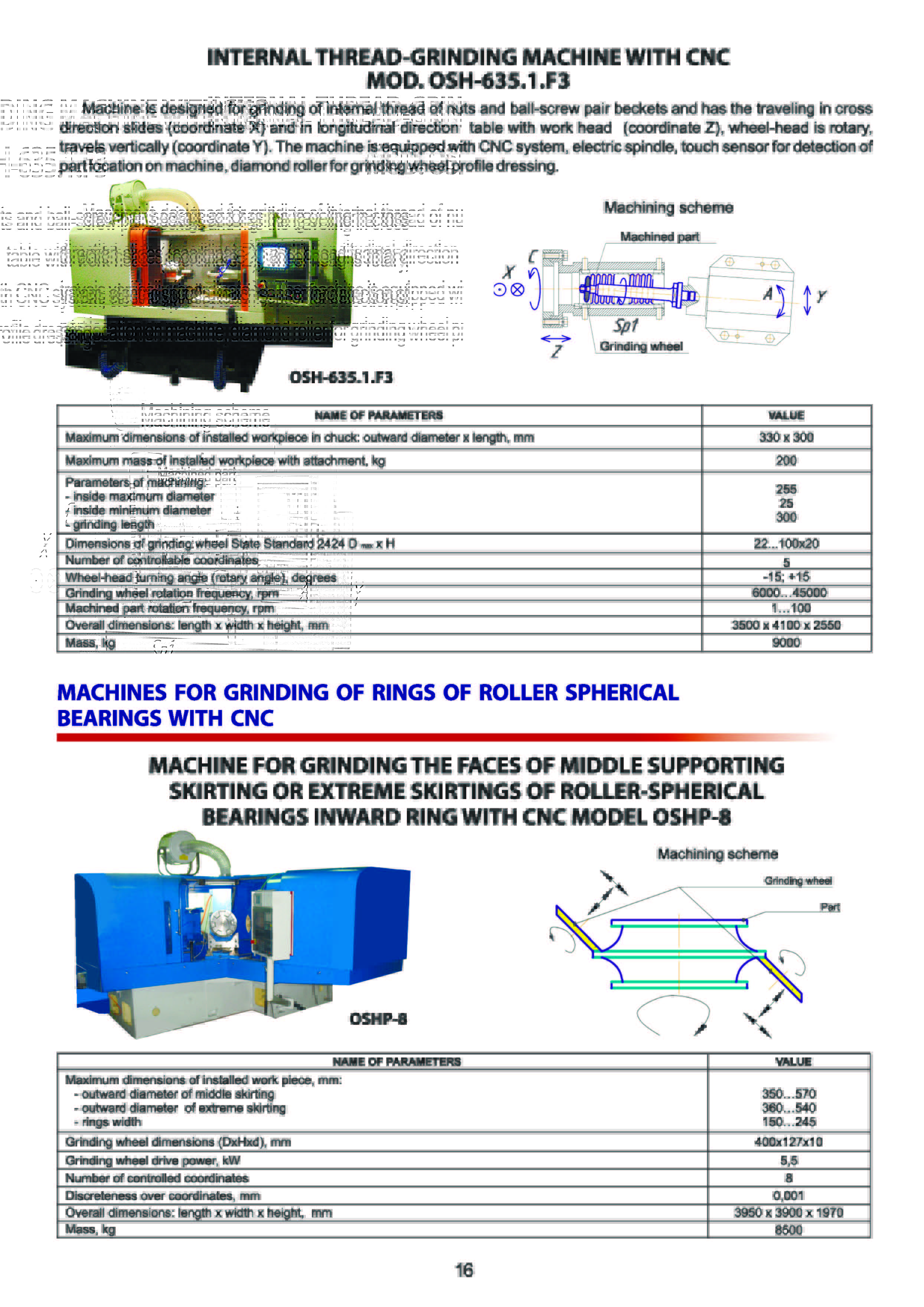 Internal thread grinding machine with CNC model OSH-635FЗ is designed for grinding the internal thread of nuts and ball-screw pair beckets and has the traveling in cross direction slides (coordinate X) and in longitudinal direction table with work head (coordinate Z), wheel head is rotary, travels vertically (coordinate Y). The machine is equipped with CNC system, electric spindle, touch sensor for detection of part location on machine, diamond roller for grinding wheel profile dressing.